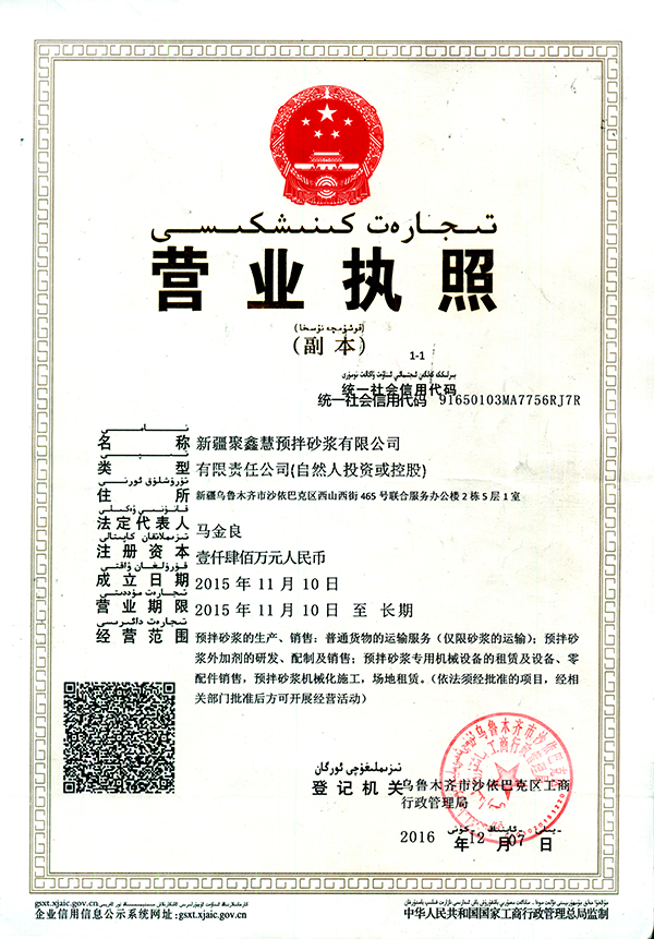 1、公司自成立以来的历史沿革:巴沙体育app最新版注册成立于2015年11月,注册资本金1400万元。是以兵团国有资本占69%,个人出资占31%成立的股份制企业。公司位于乌鲁木齐西山秦丰北路1920号。生产线占地面积50亩,规划设计年产40万吨干混砂浆生产线两条。目前有一条生产线已正常投产。可生产“鑫”牌优质普通砂浆(包括普通砌筑砂浆、普通抹灰砂浆、地坪砂浆、防水砂浆)和特种砂浆(包括外墙外保...